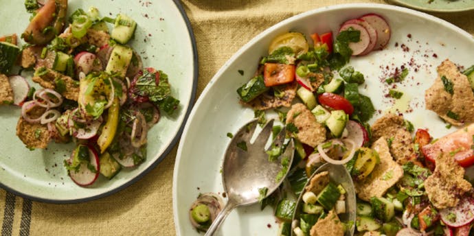 This is a thick, delicious frittata-like mixture of courgettes, leeks, peas, herbs and eggs. In Palestine, it’s often made with finely chopped herbs and onions. I like the addition of fresh mint, dried mint and dill or fennel seeds. Good with chopped salad, shatta and warm bread.