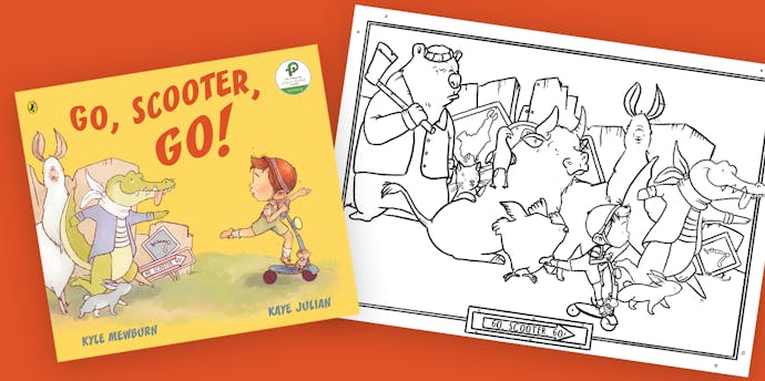 Download this colouring sheet from Kaye Julian, illustrator of the energetic and fun picture book Go, Scooter, Go!